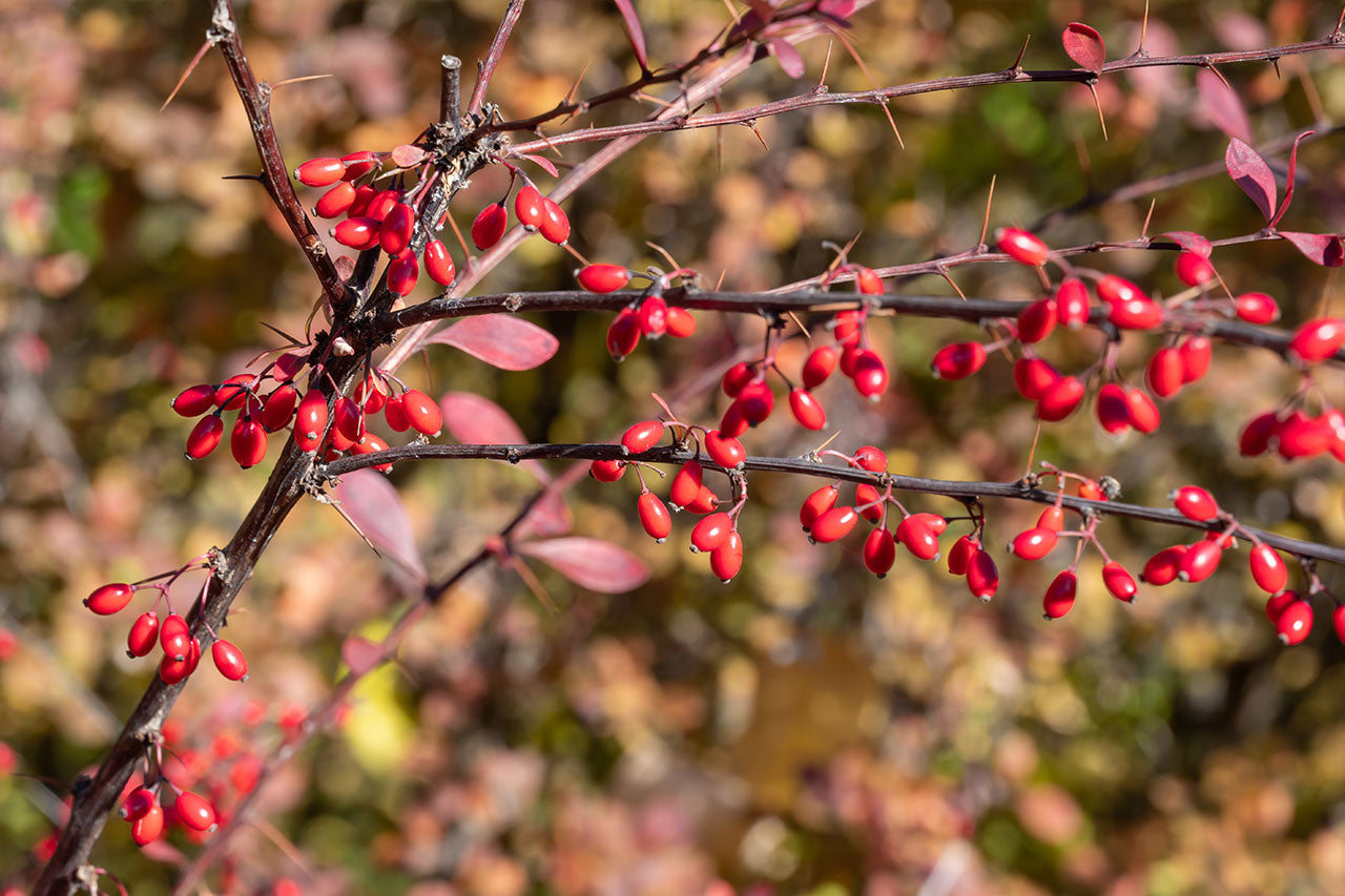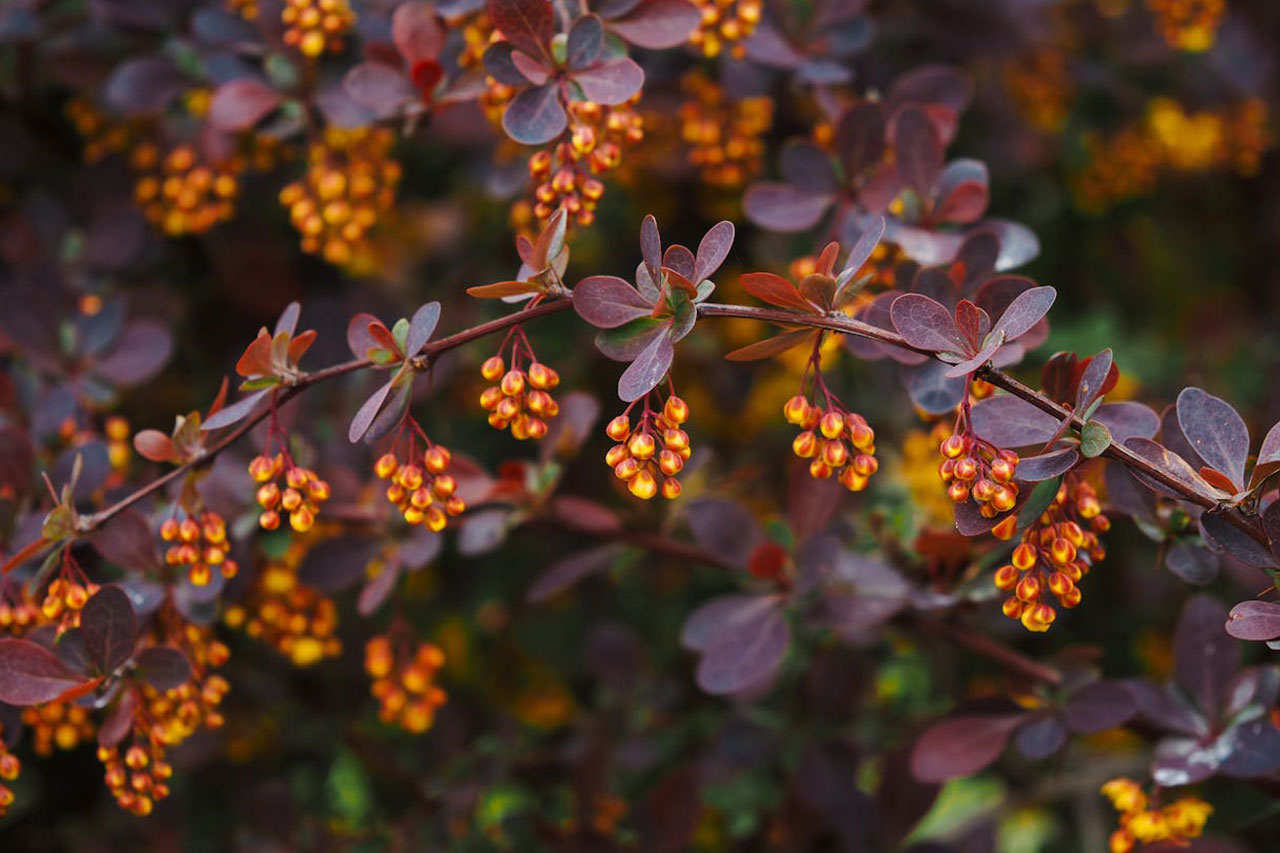 Barberry shrubs, or Berberis, are known for their dense, spiny branches, colourful foliage, and seasonal berries. With a wide range of cultivars available, their leaves can vary from bright green to deep purple or even golden-yellow, creating a vibrant splash of colour in mixed borders or hedges. In spring, small yellow or orange flowers emerge, adding charm and attracting pollinators. These are followed by bright red or blue-black berries in autumn, which are not only visually striking but also a valuable food source for birds.