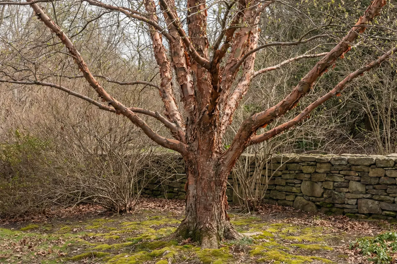 A handsome Chinese red birch whose peeling bark reveals cinnamon, copper and salmon tones that glow in winter light. Its airy canopy brings a soft woodland feel, and a small grove makes a show-stopping backdrop to evergreens, grasses and winter interest.