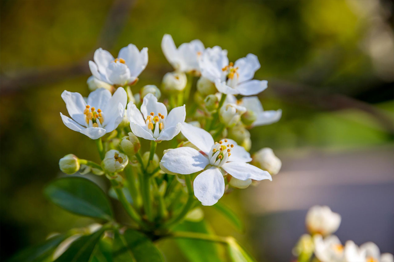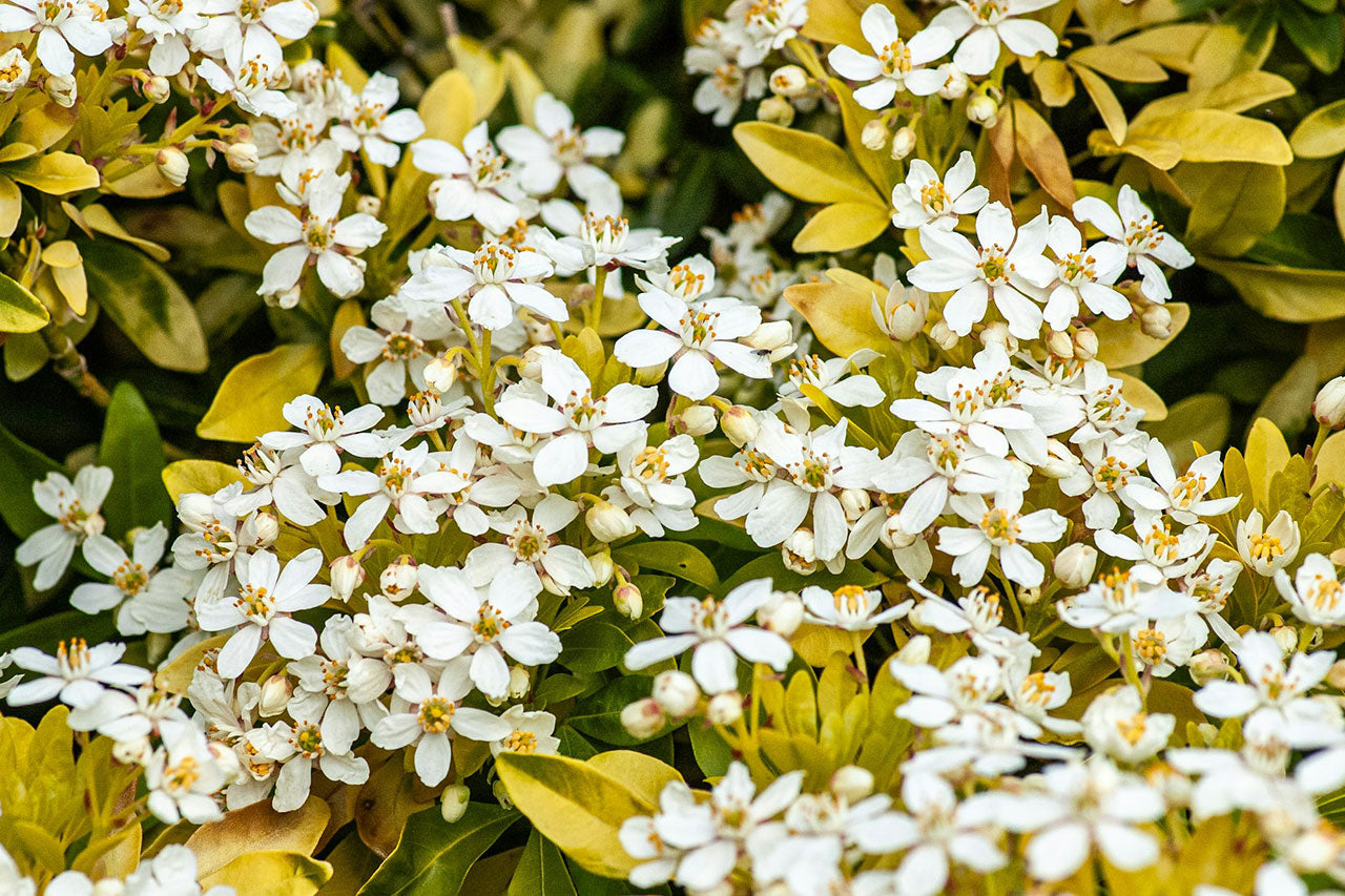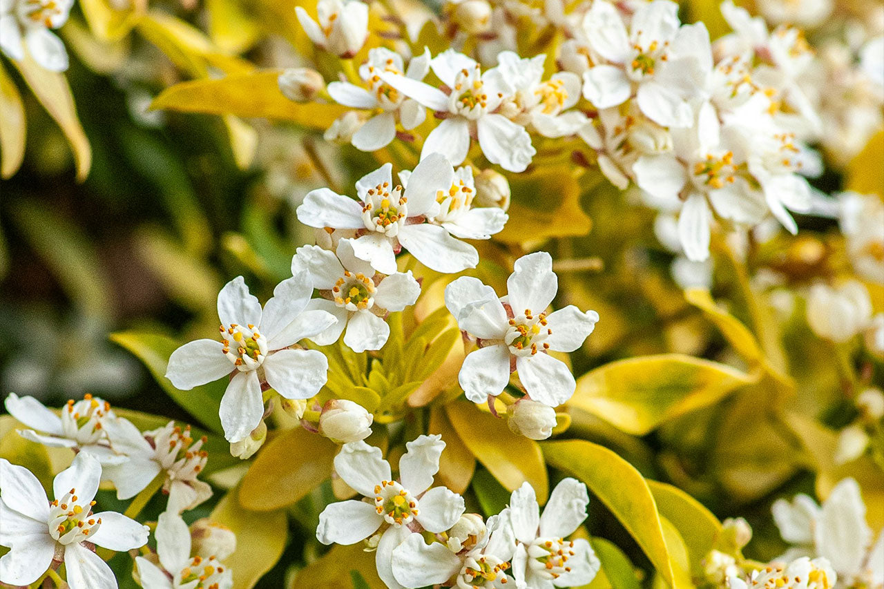 Choisya, commonly called Mexican Orange Blossom, is an evergreen shrub prized for its glossy, aromatic leaves and fragrant white flowers. Blooming in late spring and often again in autumn, the star-shaped flowers exude a citrus-like scent, bringing a touch of the Mediterranean to the garden. The foliage, which can be deep green or golden yellow depending on the variety, adds a luminous, year-round presence that’s perfect for brightening borders, patios, or urban spaces. Choisya’s neat, rounded shape makes it a natural choice for informal hedges, foundation plantings, or as a stand-alone feature.